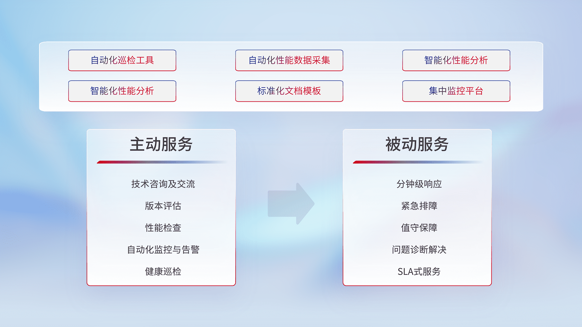智能化工具和标准化文档,,,保障服务质量,,,提供主动服务(包含技术咨询、、、、版本评估、、、性能检查、、、自动化监控与告警、、、健康巡检)和被动服务包含(分钟级响应、、、、紧急排障、、、、值守保障、、问题诊断解决、、SLA服务)。。